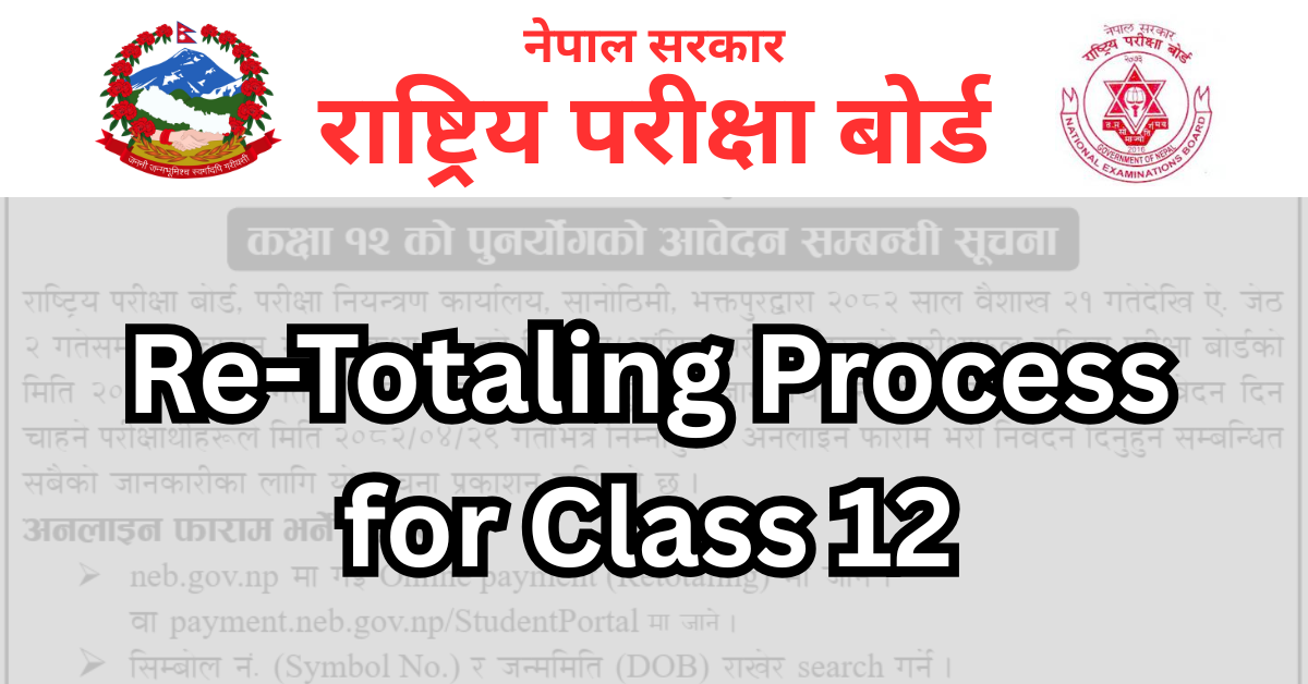 National Examination Board (NEB) has issued notice regarding retotaling process for both regular and partial examinee on 2082/04/19. This re-totaling is for those who are not satisfied with your results and want to apply for re-totaling, then you can fill out the online form by 29th Shrawan 2082.